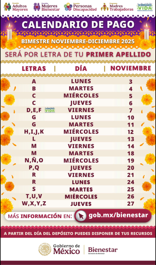 📅 Calendario de Pago Bienestar – Bimestre Noviembre–Diciembre 2025